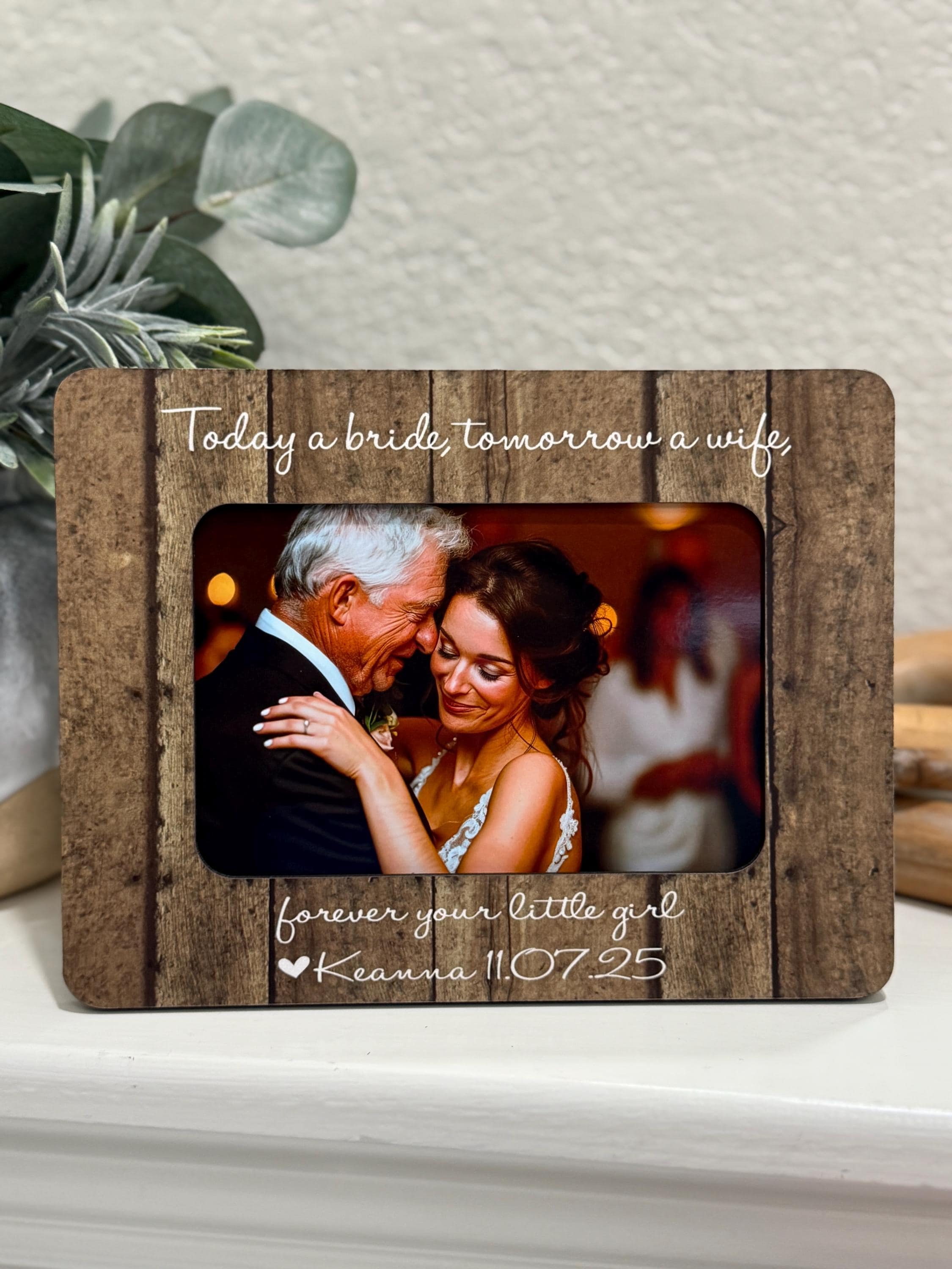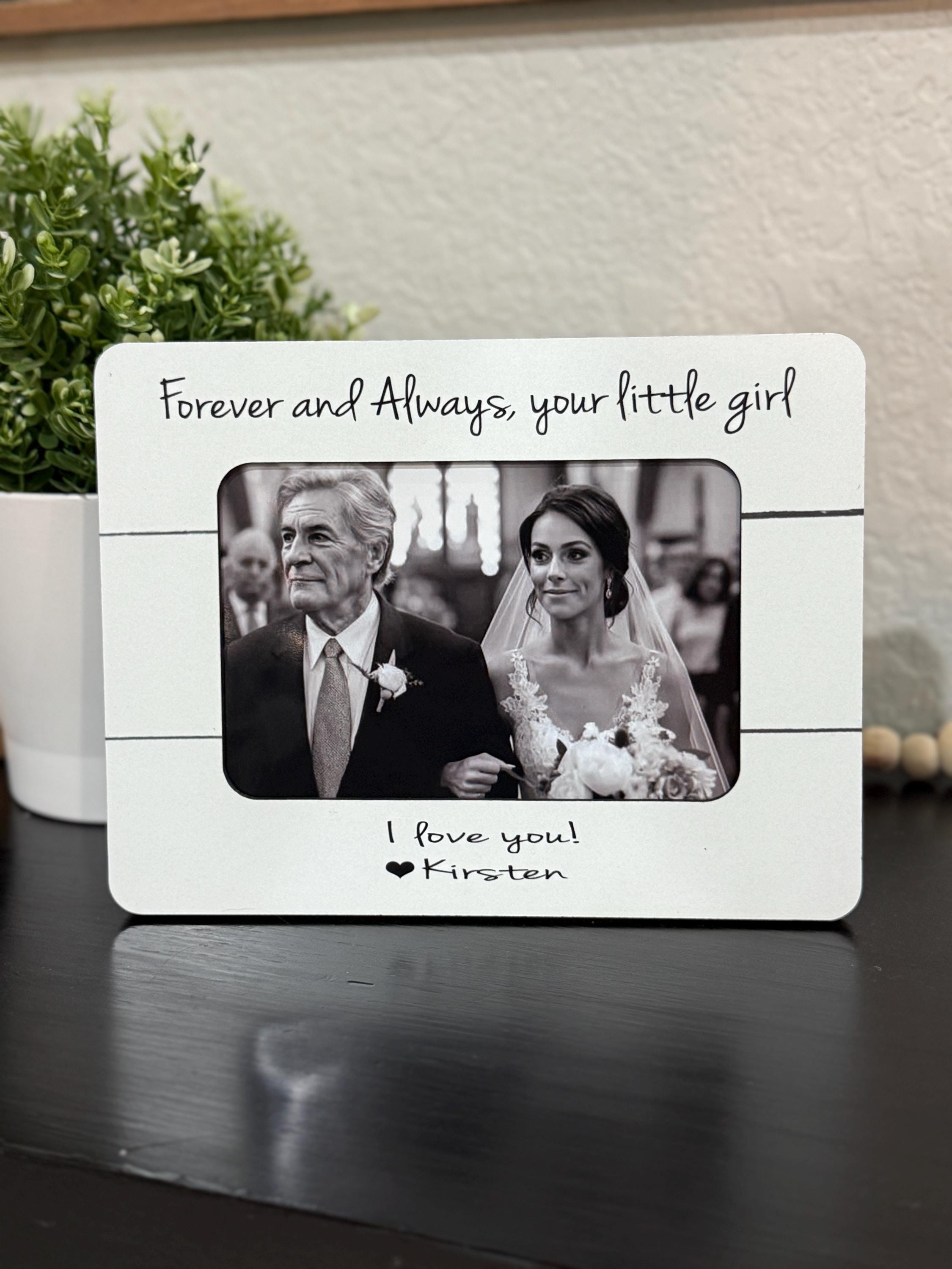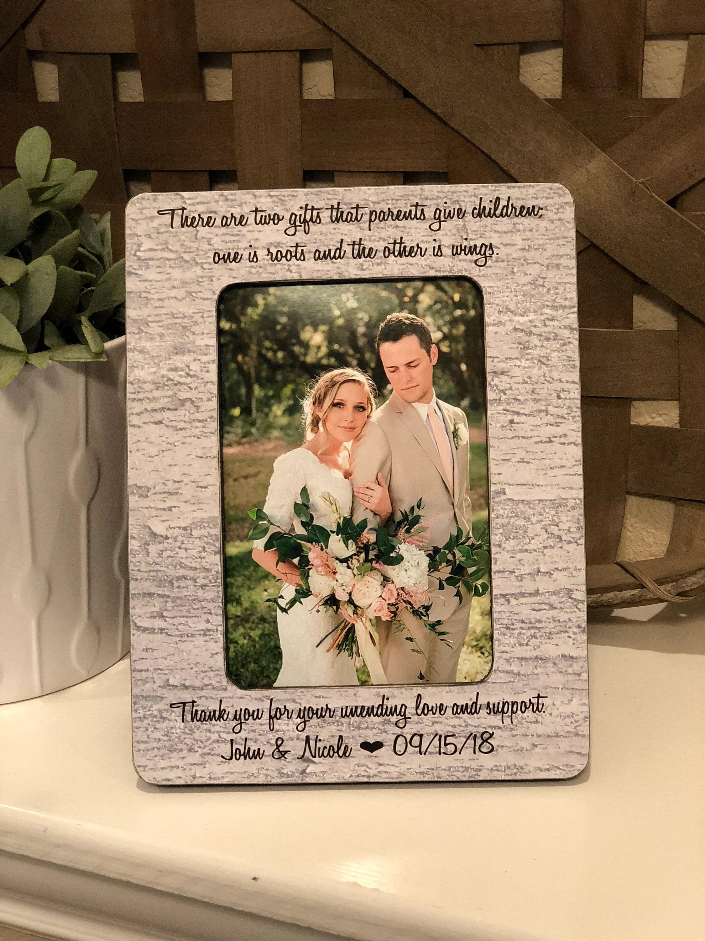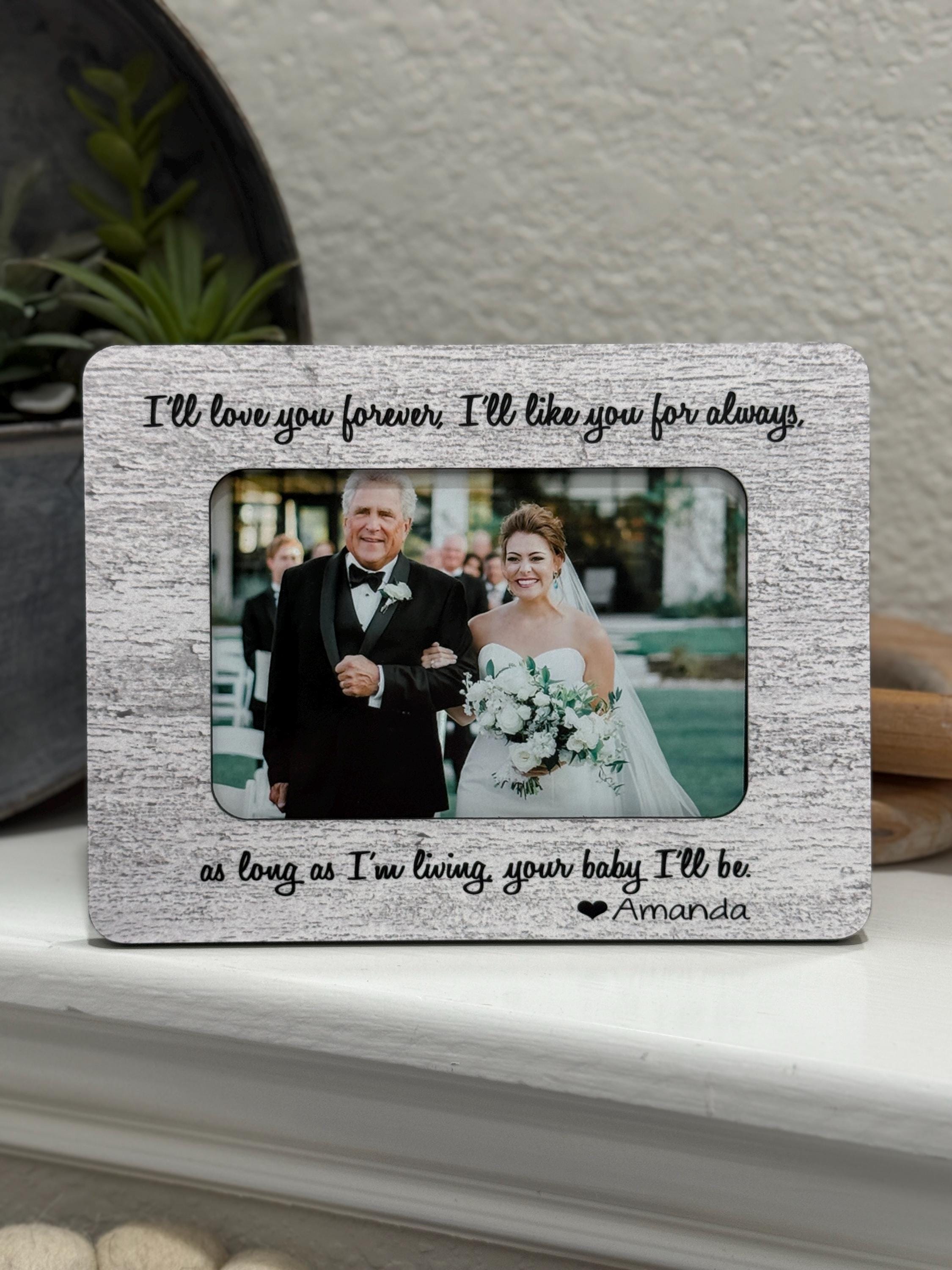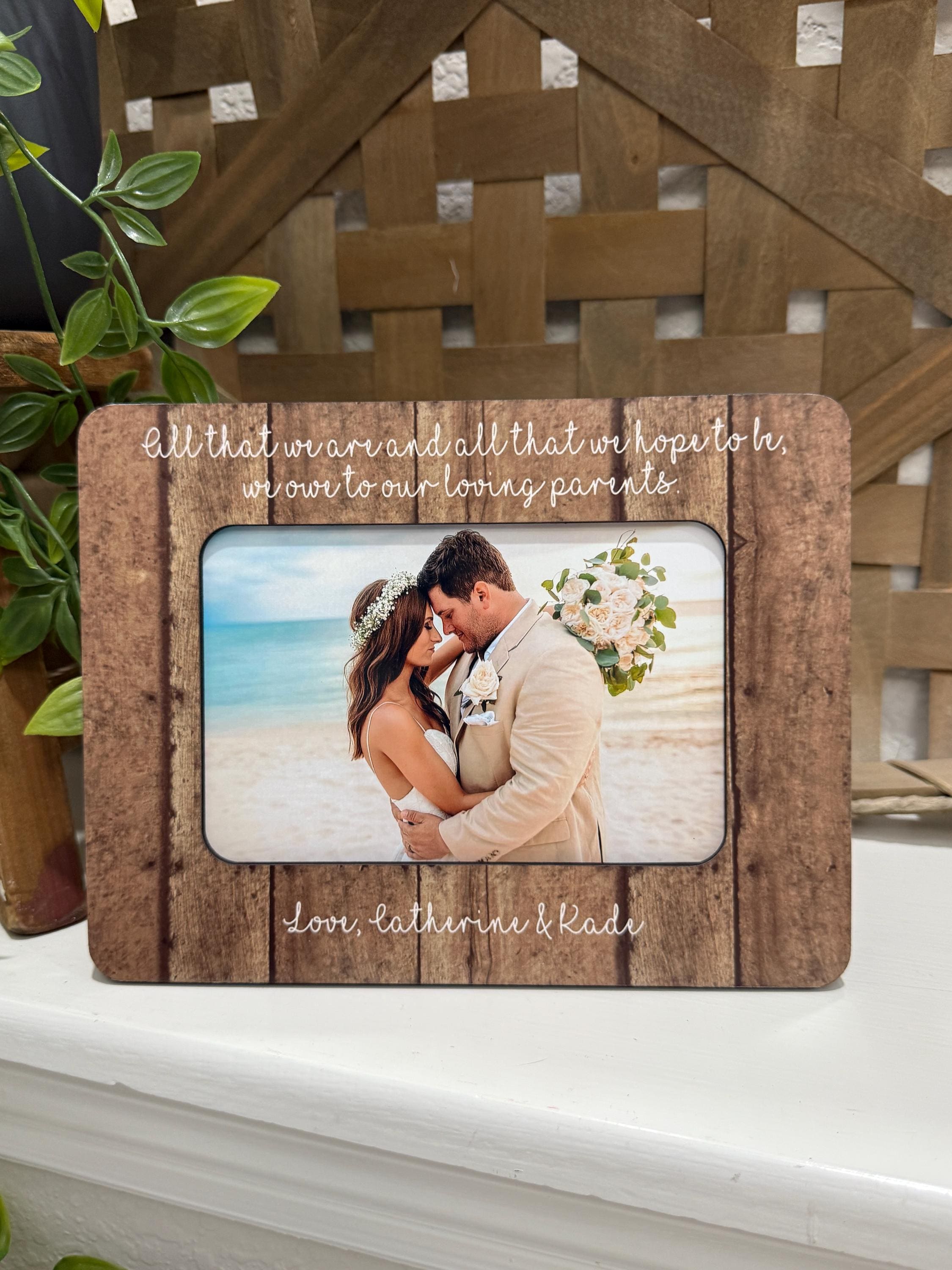 This personalized picture frame is a meaningful way for a bride to honor her mother on her wedding day. Featuring the heartfelt message of your choice and space for a 4x6 photo, this handmade frame becomes a keepsake she’ll treasure forever.