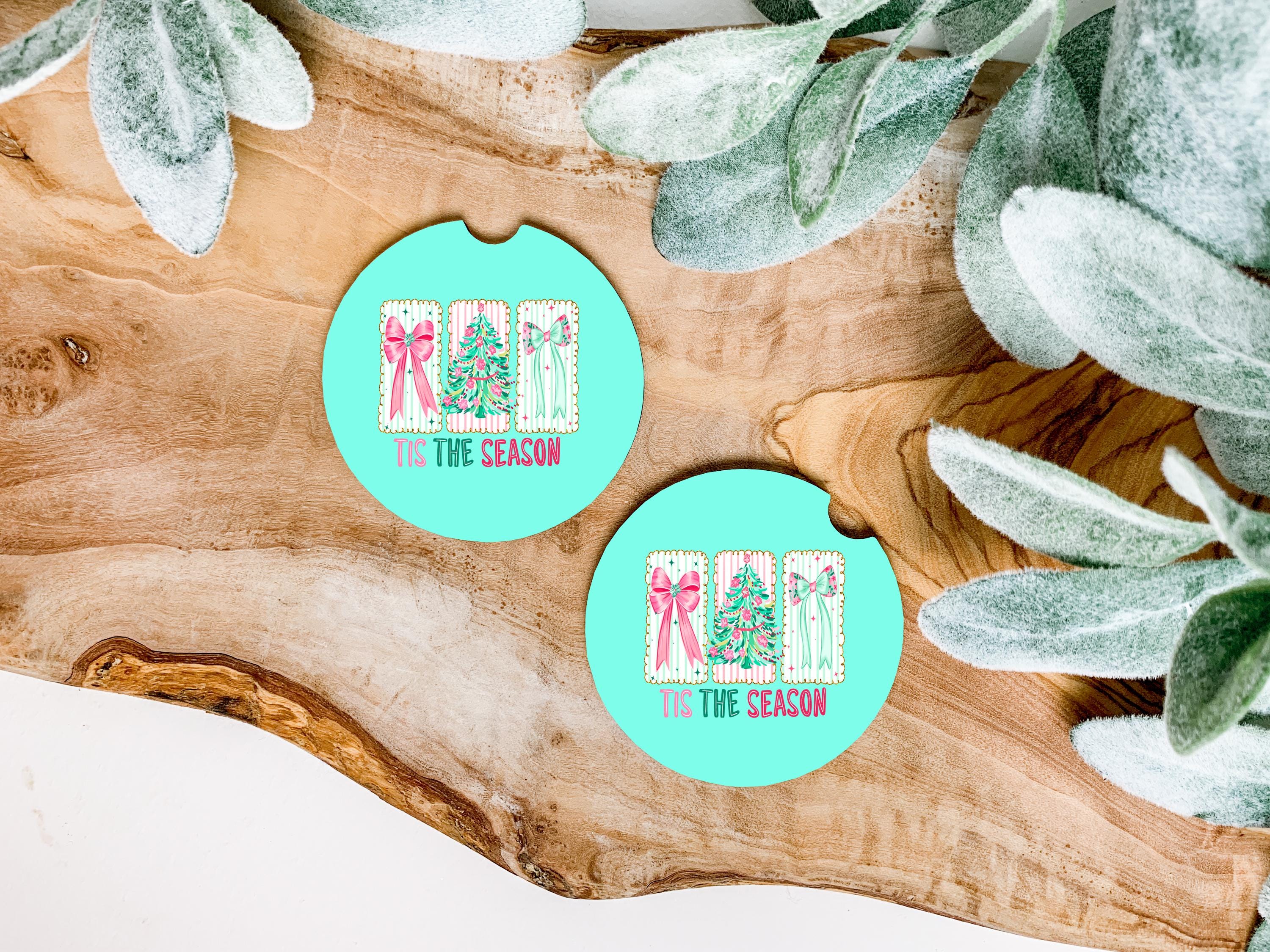 Celebrate the holidays every time you drive with this “Tis the Season” car coaster, featuring cute trees and bows on a pink stripe background. Designed for those who love festive, cheerful car accessories, this coaster adds a pop of holiday spirit to your cup holders.